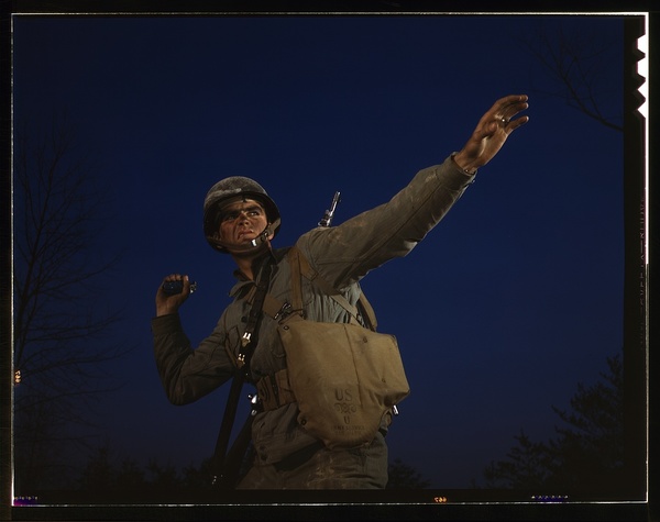 An American pineapple, of the kind the Axis finds hard to digest, is ready to leave the hand of an infantryman in training at Fort Belvoir, Va. American soldiers make good grenade throwers