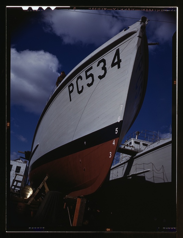 Another harrier of the U-boats nears completion at an eastern boat yard, Marine Construction Co., Stamford, Conn. Many new 110-foot wooden sub-chasers are taking the water these days at yards in all parts of the country