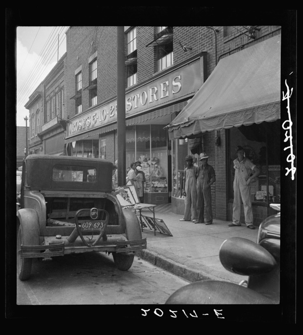 Appliqued embroideries for sale on street in front of ten cent store. Saturday afternoon. Siler City, North Carolina