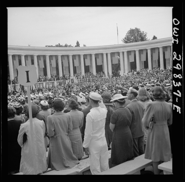 Arlington Cemetery, Arlington, Virginia. A crowd standing to sing the "Star Spangled Banner" on Memorial Day