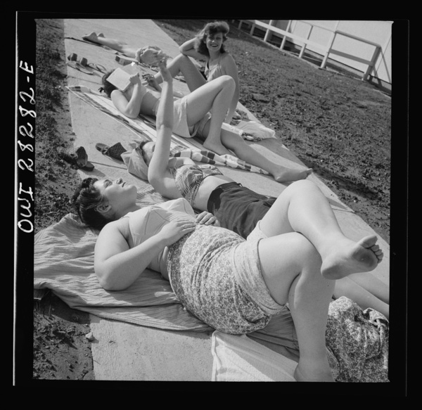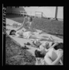 Arlington Farms, war duration residence halls. Sunbathers on the sidewalk in the back of Idaho Hall at Arlington Farms