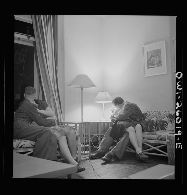 Arlington, Virginia. Girls entertaining their guests in one of the two card rooms, at a residence for the women who work in the U.S. government for the duration of the war. More privacy is afforded here than in the main lounge