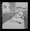 Arlington Farms, war duration residence halls. Sunbathers on the sidewalk in the back of Idaho Hall at Arlington Farms