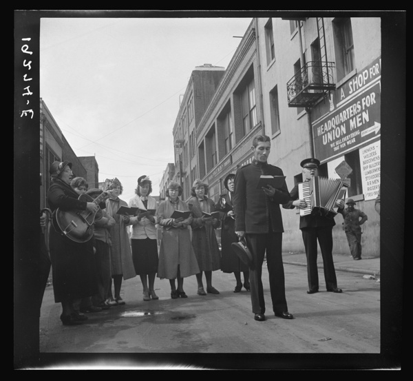 At Minna Street the army forms a semi-circle and sings to attract a crowd. Salvation Army, San Francisco, California