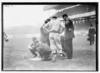 Pre-game activities at home plate involving managers, umpires, and grounds crew