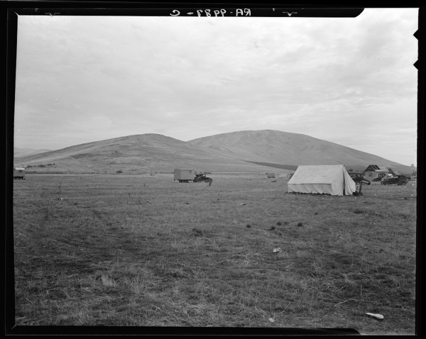 1936 drought refugee from Polk, Missouri. Awaiting the opening of orange picking season at Porterville, California