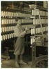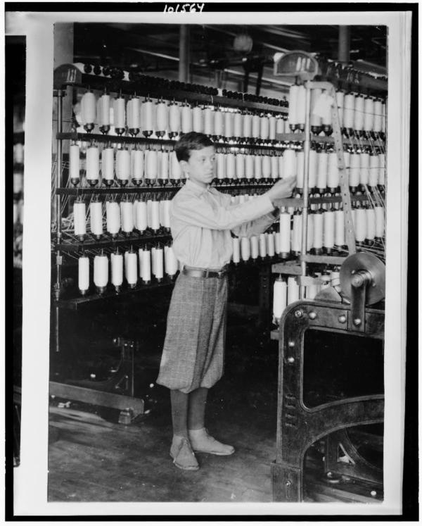 Back boy - 14 years old - Mule room. Berkshire Cotton Mills. Location: Adams, Massachusetts. / Lewis W. Hine.