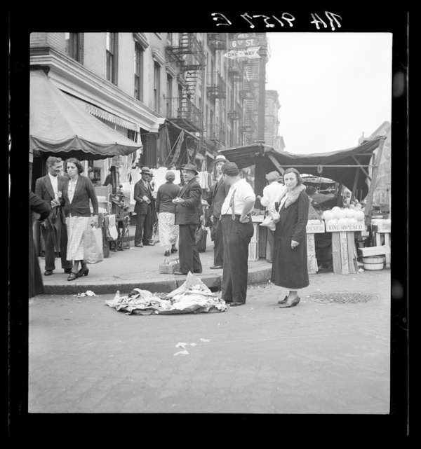 Background photo for Hightstown project. Sixth Street and Avenue C, New York City, where the Solomon family do their shopping. In the street and displayed on newspaper. All socks for sale at ten cents the pair