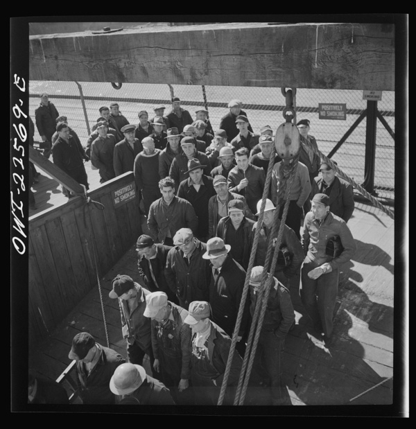 Baltimore, Maryland. Eighteen hundred workers are carried from the Bethlehem Fairfield shipyard to Baltimore on a former Wilson Line pleasure boat. The trip takes twenty minutes