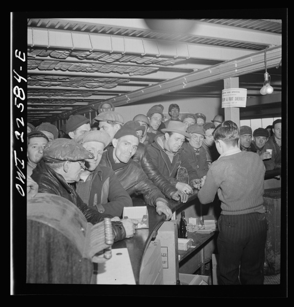 Baltimore, Maryland. Eighteen hundred workers are carried from the Bethlehem Fairfield shipyard to Baltimore on a former Wilson Line pleasure boat. The trip takes twenty minutes drinks