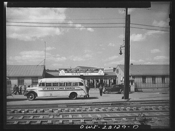 Baltimore, Maryland. Every available bus in Baltimore has been pressed into service to fill wartime transportation needs. A church bus is waiting outside the Bethlehem Fairfield shipyard gates before three o'clock whistle