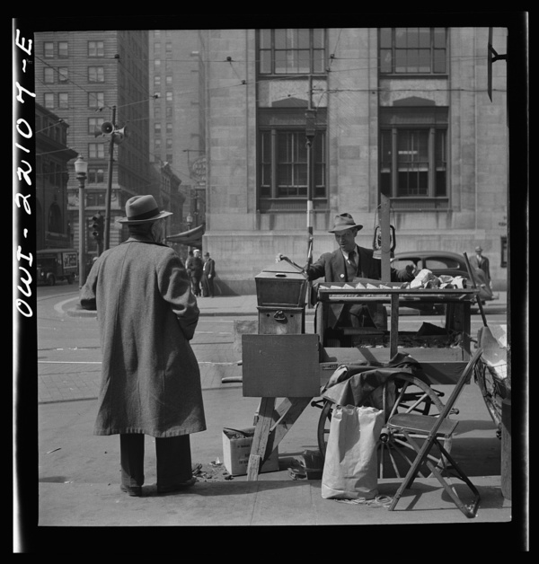 Baltimore, Maryland. Rushing to catch a trackless trolley home from work at four p.m.