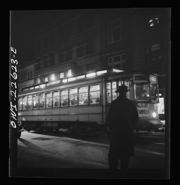 Baltimore, Maryland. Trolley carrying workers to the night shift at the Bethlehem Fairfield shipyard