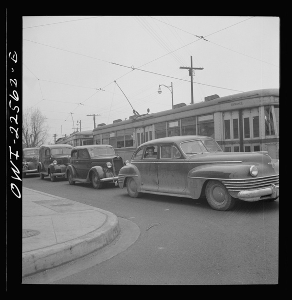 Baltimore, Maryland. Trolleys and cars leaving the Bethlehem Farifield shipyard on the road to Baltimore at three p.m. Workers are sharing the front car