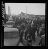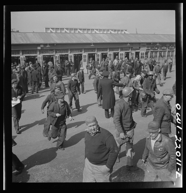 Baltimore, Maryland. Second shift workers leaving the Bethlehem Fairfield shipyard at three p.m. making a dash for cars parked along the road