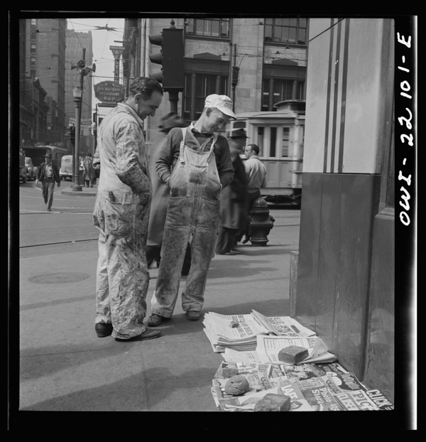 Baltimore, Maryland. Workers reading the newsstand papers while waiting for a trolley after work