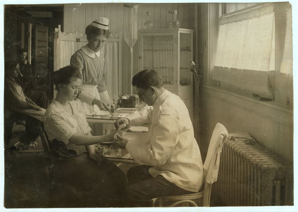 Bandage on injured finger in Hospital. Hood Rubber Co., Cambridge. Location: Cambridge, Massachusetts / Lewis W. Hine.