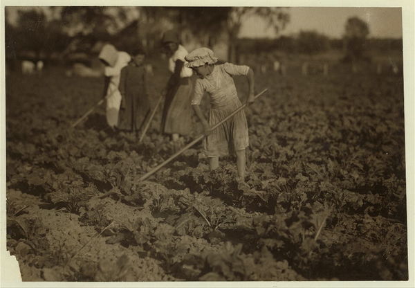 Barbara Lieber, nine-year old beet worker hoeing with her eleven-year old sister on a Wisconsin farm near St. John. See Hine Report, Wisconsin Sugar Beet, July 1915. Location: St. John vicinity, Wisconsin.