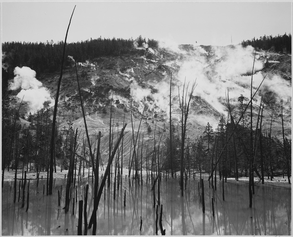 Barren tree trunks rising from water in foreground, stream rising from mountains in background, "Roaring Mountain, Yellowstone National Park," Wyoming.