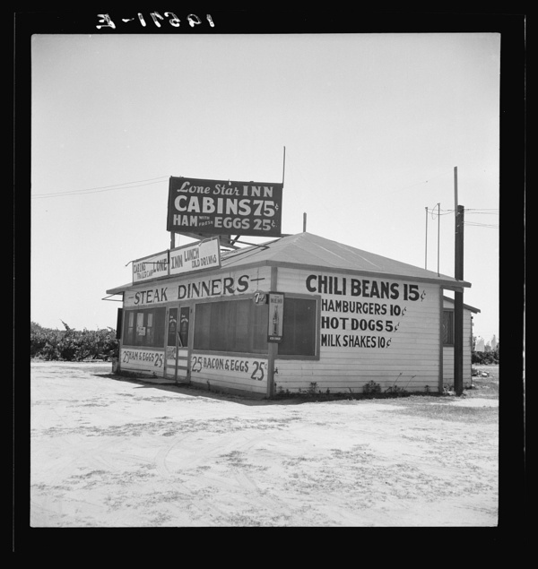 Between Tulare and Fresno on U.S. 99. See general caption. A large variety and great number of small eating places face the highway. This one is managed by ex-Texans, hence "Lone Star Inn"