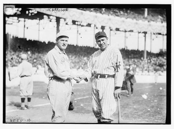Bill Carrigan (Boston AL) & Chief Meyers (New York NL) during World Series at Polo Grounds, NY, 1912 (baseball)