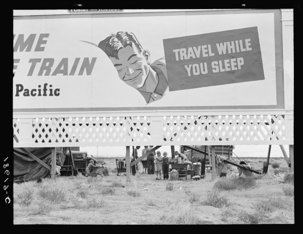 Billboard along U.S. 99 behind which three destitute families of migrants are camped. Kern County, California