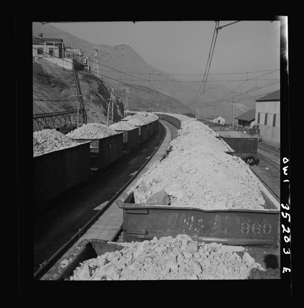 Bingham Canyon, Utah. Loads of ore from the Utah Copper Company open-pit workings at Carr Fork