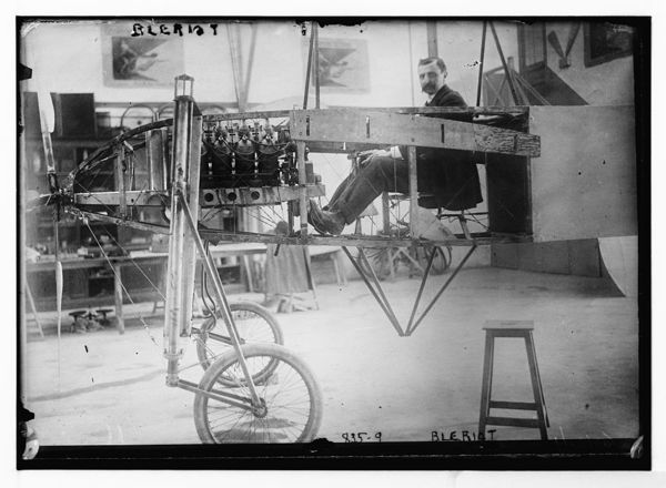 Bleriot, in workshop, in his flying machine