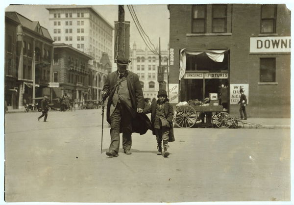 Blind man and his youthful guide. Location: Oklahoma City, Oklahoma / Lewis W. Hine.