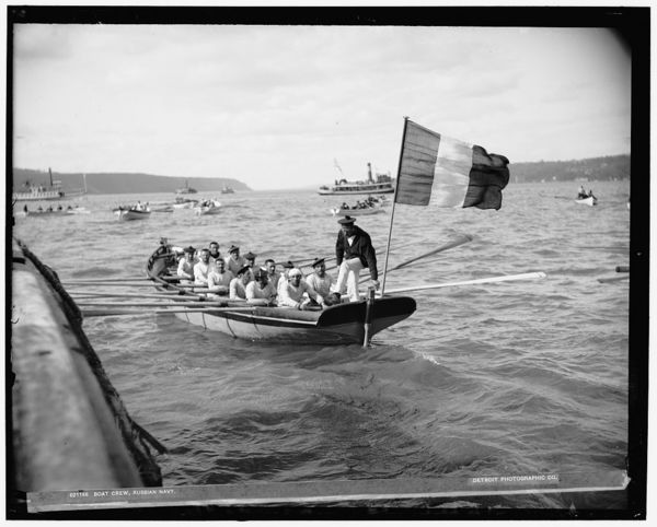 Russian boat crews being towed to races, Columbian Naval Parade, 1892 i.e. 1893