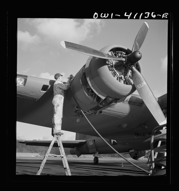 Boeing aircraft plant, Seattle, Washington. Production of B-17F (Flying Fortress) bombing planes. Lubricating and servicing a new B-17F (Flying Fortress bomber