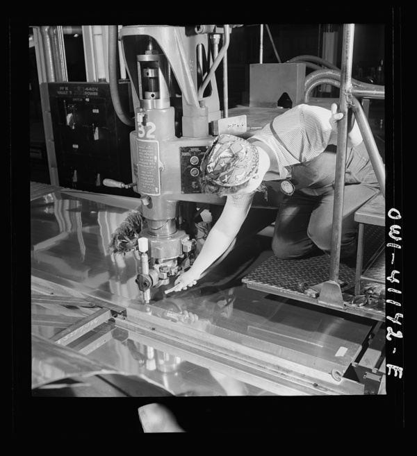 Boeing aircraft plant, Seattle, Washington. Production of B-17F (Flying Fortress) bombing planes. A spot welder