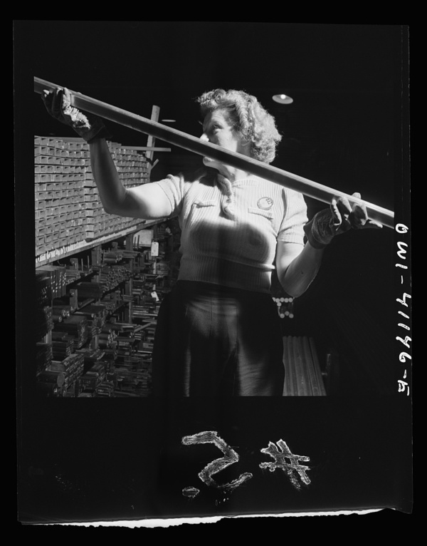 Boeing aircraft plant, Seattle, Washington. Production of B-17F (Flying Fortress) bombing planes. Warehouse worker handing out material for the building of B-17F (Flying Fortress) bombers