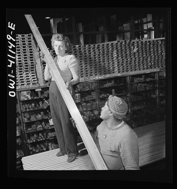 Boeing aircraft plant, Seattle, Washington. Production of B-17F (Flying Fortress) bombing planes. Warehouse worker handing out material for the building of B-17F (Flying Fortress) bombers