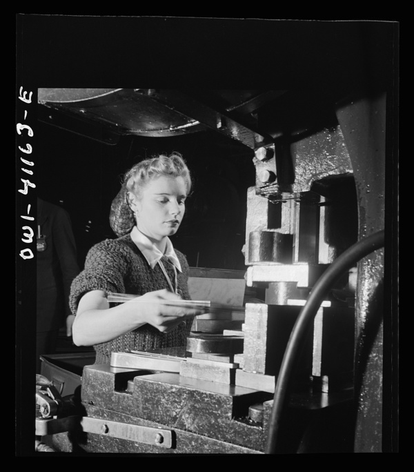 Boeing aircraft plant, Seattle, Washington. Production of B-17F (Flying Fortress) bombing planes. Girl working on a machine