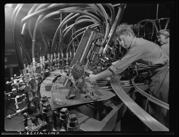 Boeing aircraft plant, Seattle, Washington. Production of B-17 (Flying Fortress) bombing planes. Octupus punching machine working on parts for B-17 (Flying Fortress) bombers