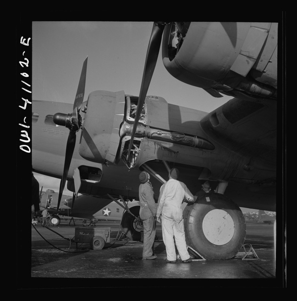 Boeing aircraft plant, Seattle, Washington. Production of B-17F (Flying Fortress) bombing planes. Lubricating and servicing a new B-17F (Flying Fortress) bomber