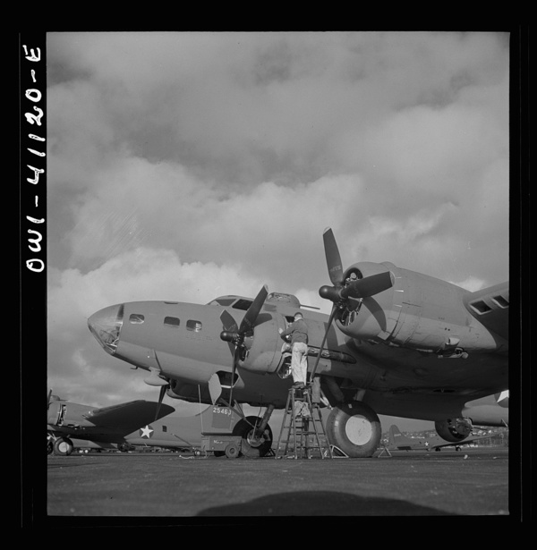 Boeing aircraft plant, Seattle, Washington. Production of B-17F (Flying Fortress) bombing planes. Lubricating and servicing a new B-17F (Flying Fortress) bomber