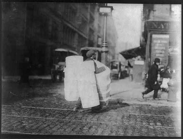 Boy carrying hats. Bleeker Street, N. Y. Location: New York, New York (State)