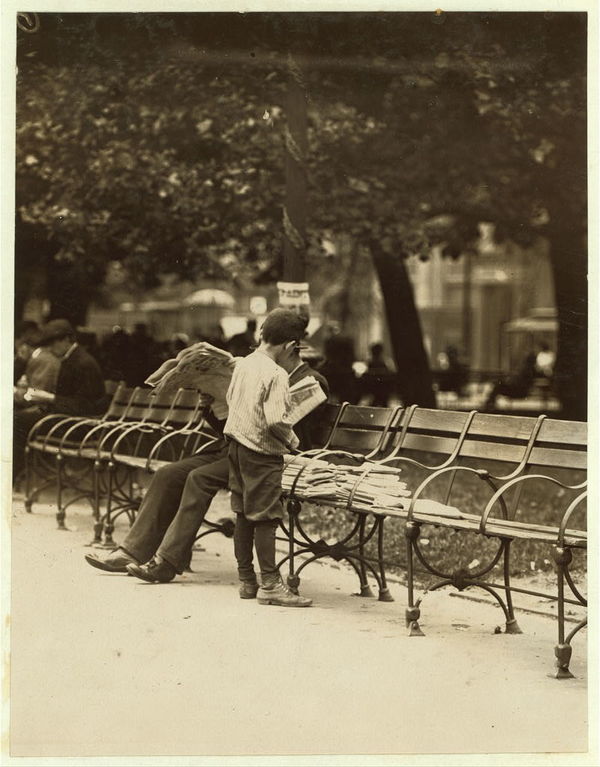 Boy collecting discarded papers in Union Square. He sells them to store-keepers. Location: New York, New York (State)