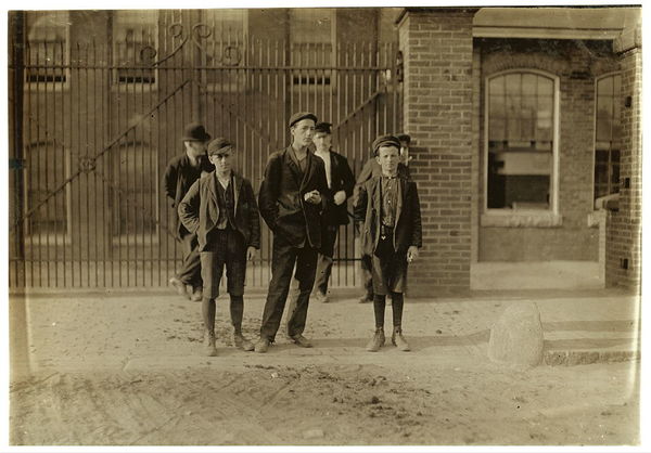 Smallest boy is Joseph Fortin, 71 Cocheco St. His mother (at home) said he is 14 years old. He does not look it. 6:00 A. M., May 15, 1909. Group going into Mill No. 1. Cocheco Mfg. Co., Dover, N.H. Location: Dover, New Hampshire.