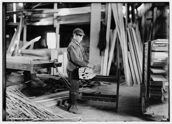 Boy probably about 13 years old, tying strips which he has taken away from the planer. Schultze Waltum Co., Planing Mill. Location: Evansville, Indiana.