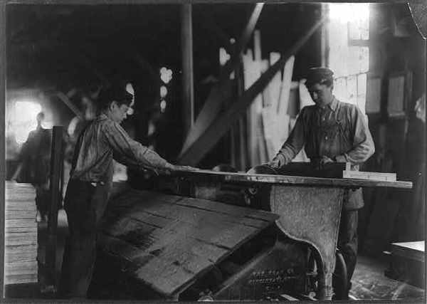 Boys taking away from saws and brading. Schultze, Waltman & Co. Planing Mill Evansville, Ind. Location: Evansville, Indiana.
