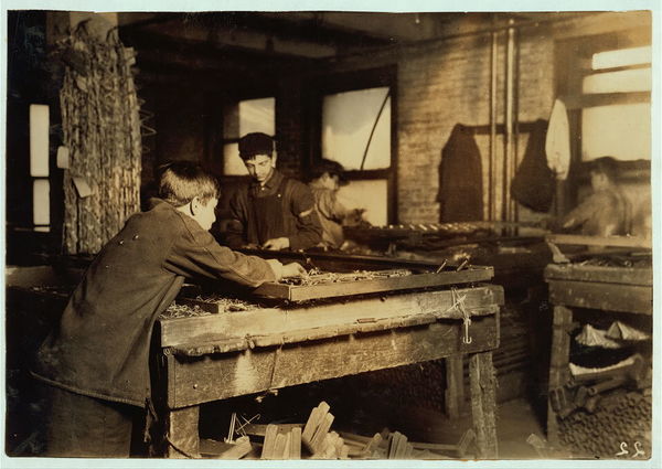 Boys "linking" bed-springs. 14 and 15 years old. Location: Boston, Massachusetts / Lewis W. Hine.