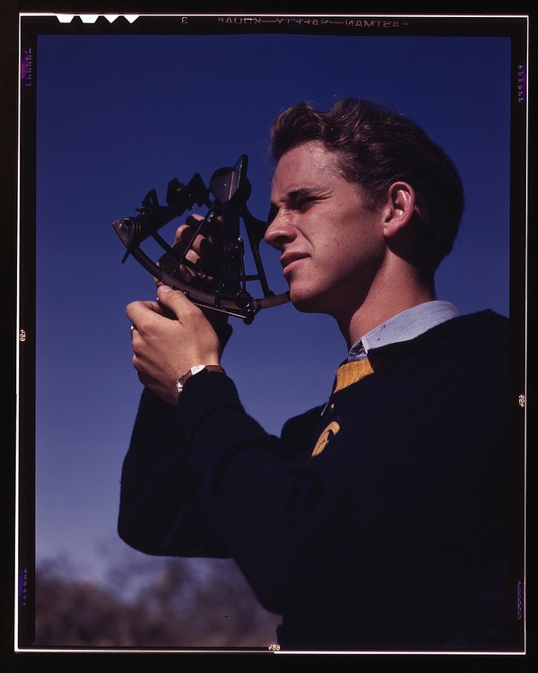 Boys trained in the fundamentals of navigation may become technicians in the armed service, Los Angeles, Calif. Thomas Graham, a member of the Victory Corps at Polytechnic High School, is learning to use a sextant to determine longitude and latitude