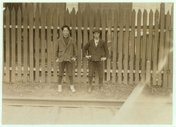 Boys working in Great Falls Mfg. Co., Somersworth, N.H. Boy on right hand is Joseph Tanguay, 80 Depot Street. Left hand boy is Henry Labreck, 14 Chesley Av. Location: Somersworth, New Hampshire.