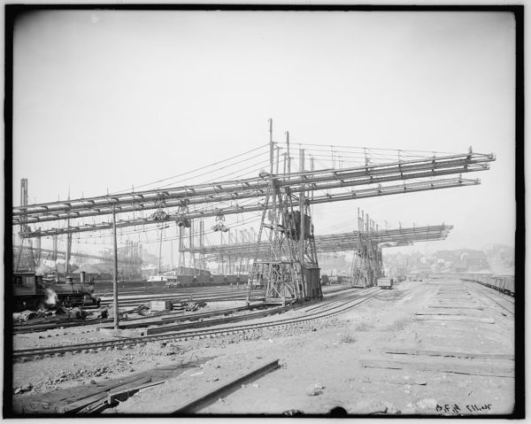 Brown electric hoist unloading freighter Constitution, Cleveland, Ohio