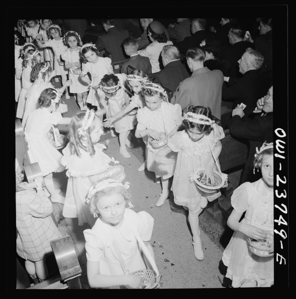 Buffalo, New York. Flower girls strewing rose petals in the procession at Easter high mass at the Corpus Christi Church in the Polish community