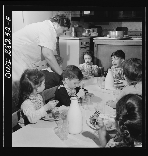 Buffalo, New York. Lakeview nursery school for children of working mothers, operated by the Board of Education at a tuition fee of three dollars weekly. Eating lunch which consists of meat and vegetables, milk, prune whip