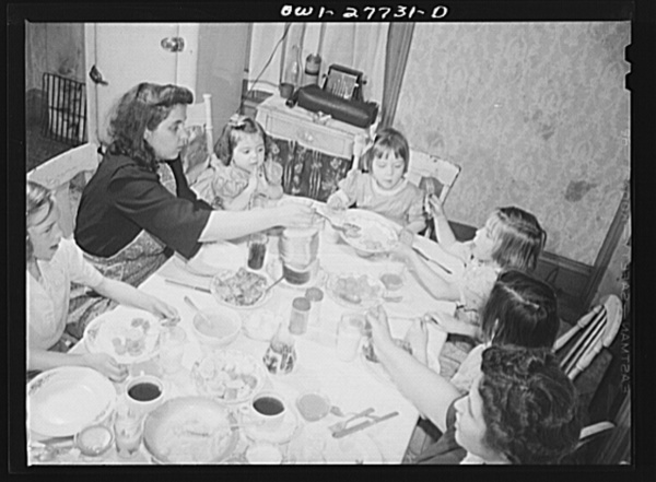 Buffalo, New York. The Grimm family eating Sunday dinner. Mrs. Grimm, a twenty-six year old widow, is a crane operator at Pratt and Letchworth. The two youngest children live in a foster home during the week